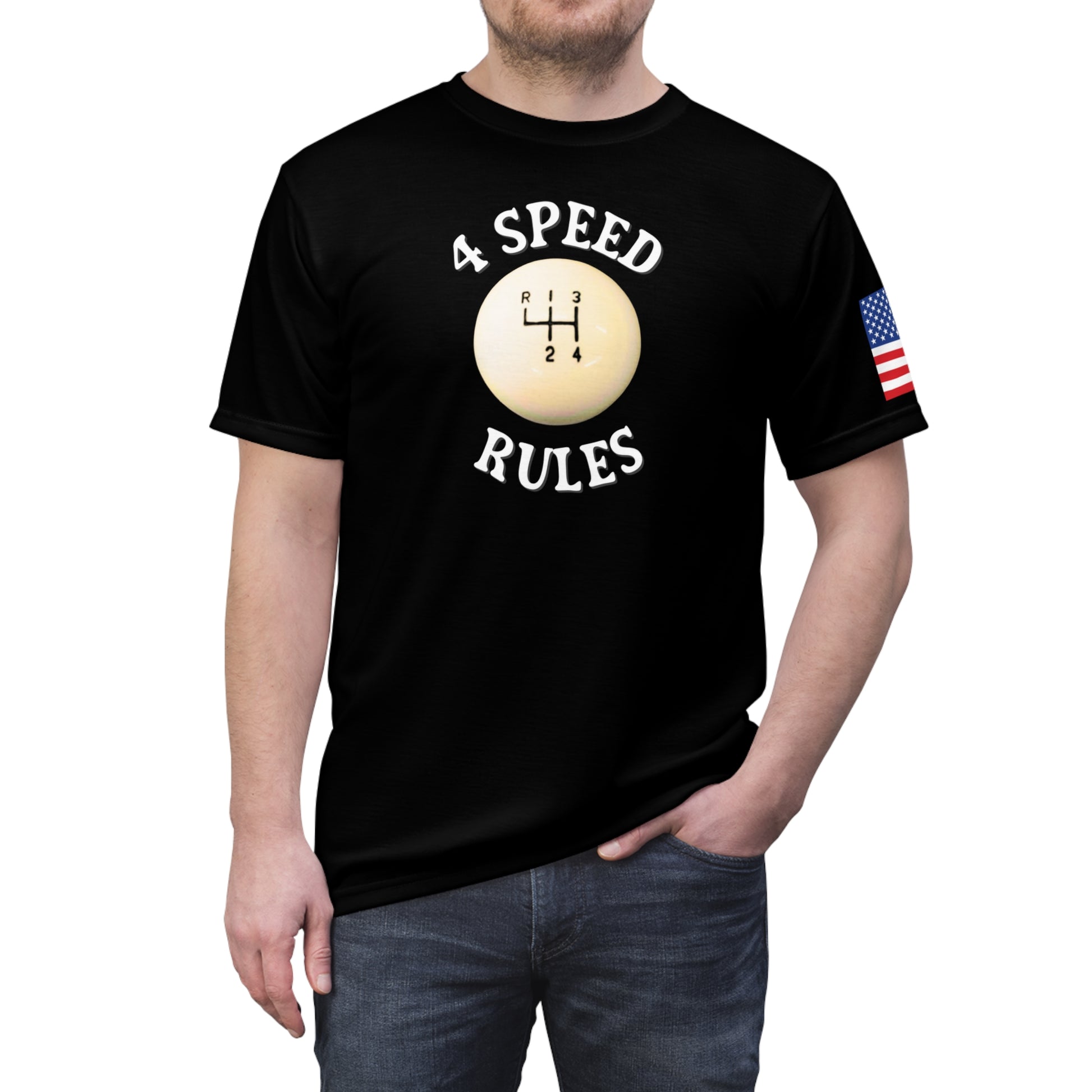 Are you a 4-Speed lover? Then this T-shirt is for you. On the front is a 4-Speed shift ball. The shirt says "4-SPEED RULES." On the left sleeve is the U.S. Flag and on the right sleeve is a 4-Speed shift pattern.